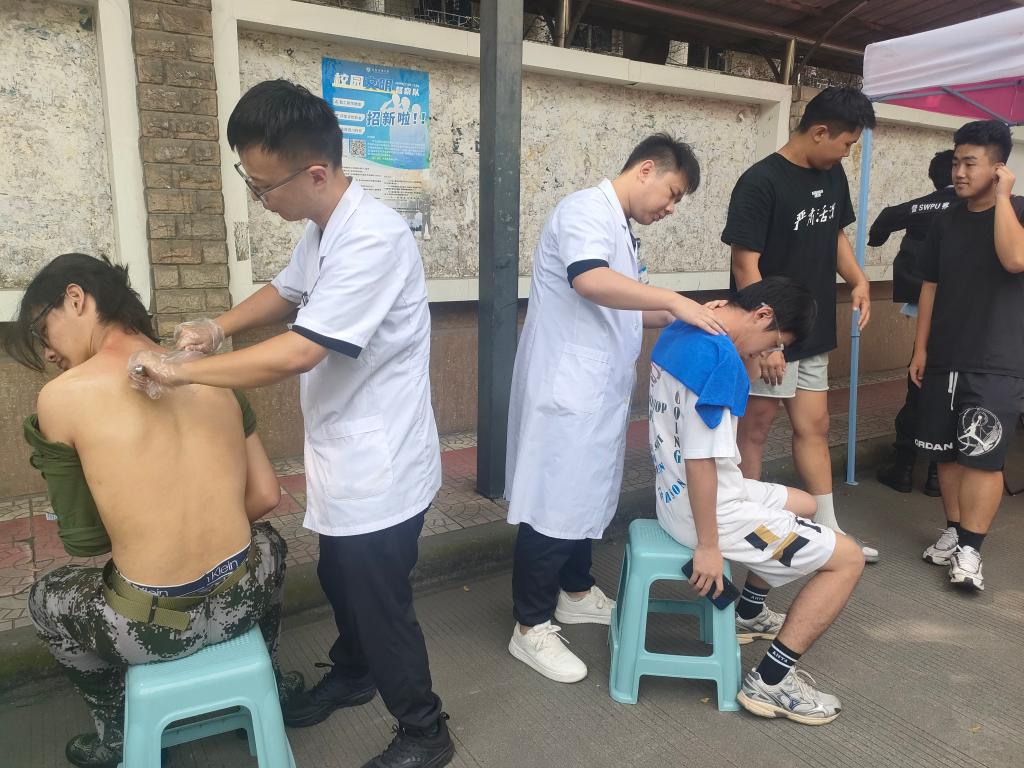 义诊现场,中医康复治疗师还为同学们给出针对性的理疗建议,现场开展筋膜刀治疗、推拿按摩等服务缓解同学们的疲劳。中医康复科医生谭科提醒参加军训的新生们,军训时可穿着厚鞋垫和舒适的袜子,以减少脚部磨损和起泡,如有不适,一定要及时就医。