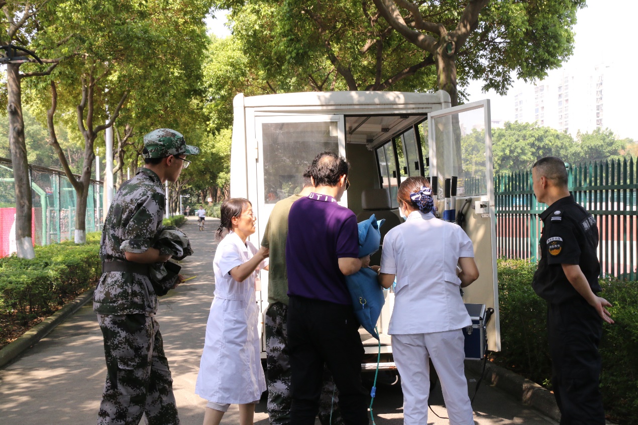 军训场边,医务人员严阵以待守护生命健康。校医院根据军训期间学生可能出现的不适症状提前制定医疗保障方案,配备治疗发热、外伤、中暑等应急药品。军训现场,遇到不慎中暑、晕倒或受伤的同学,医务人员们第一时间来到同学身边,给予针对性的治疗和处置。还有部分参训学生时因心理压力和适应困难,表现出紧张、焦虑等状态,医护人员细心观察呵护他们的心理状态并及时开展疏导。现场共计安排3组医护人员在各场地随时处置同学们的健康异常状况。