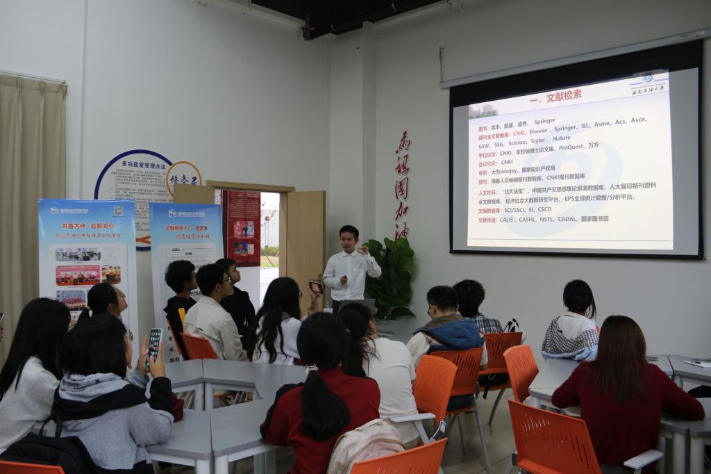 学科服务部的任科屹和马岚老师分别结合理学院和地科院的文献资源情况,介绍了不同类型文献的特点及常用数据库,通过案例演示文献检索的基本方法,帮助同学们快速熟悉和掌握文献资源,提升学术和科研效率。主管阅读推广的孔敏老师,向在场的同学介绍了图书馆丰富多彩的读者文化活动,鼓励同学们积极参加大学生信息素养大赛和图书馆杯四川全民英语口语大赛,展现自我,挑战自我。