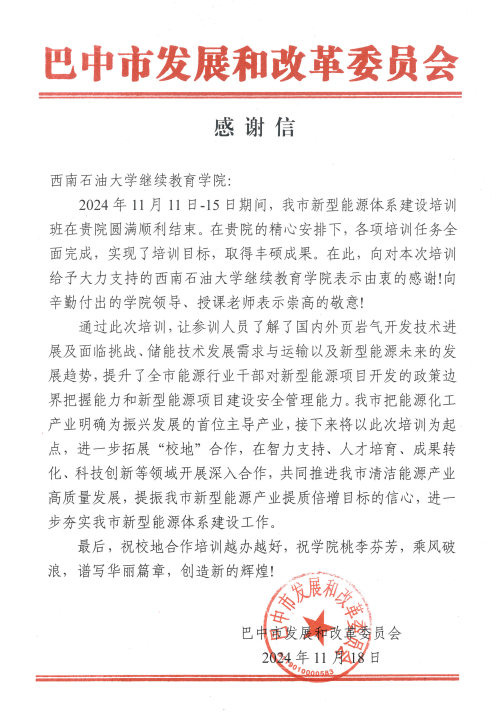 11月18日,巴中市发展和改革委员会给继续教育学院来信,对我校继续教育学院在巴中市新型能源体系建设培训班举办期间,所给予的大力支持与付出的辛勤劳动表示感谢。