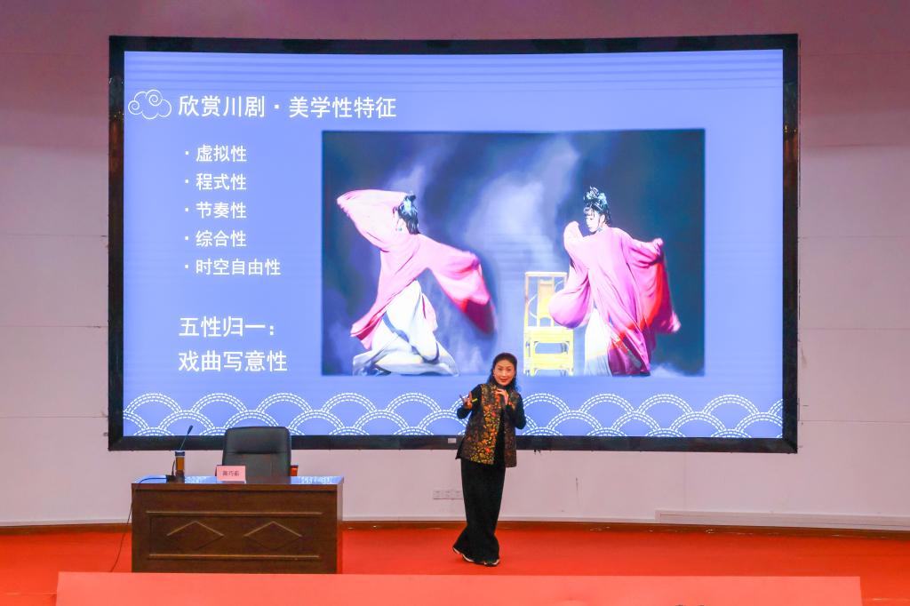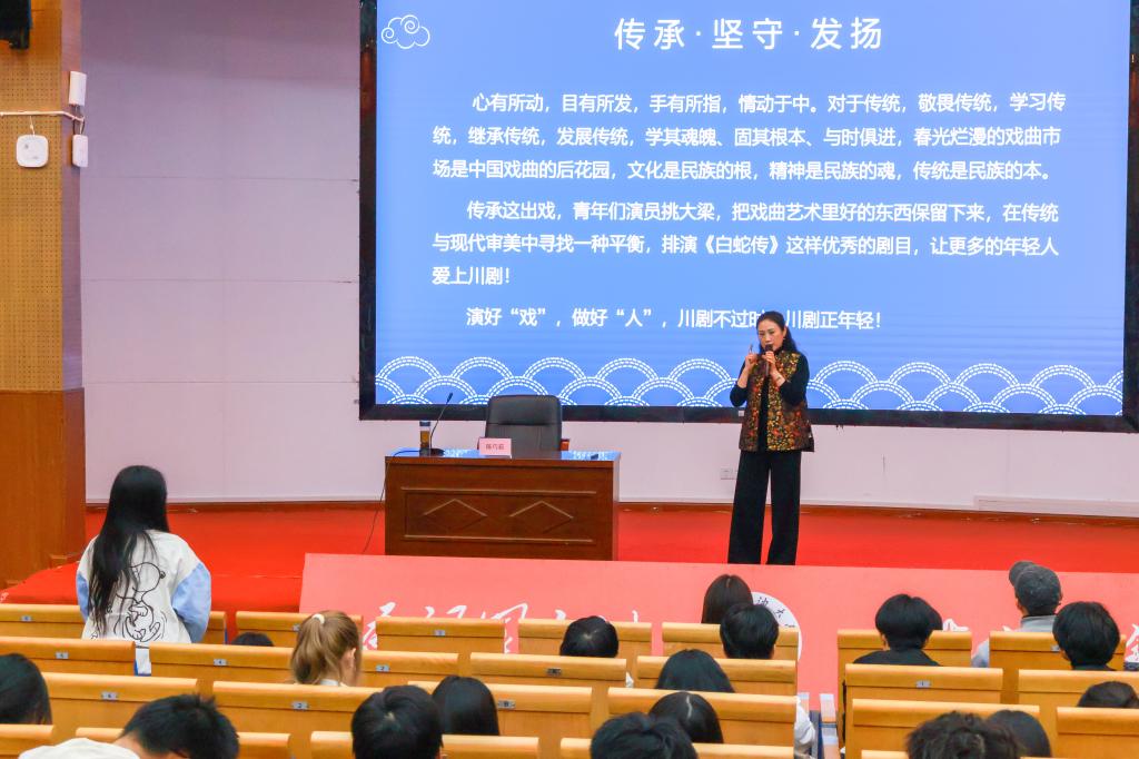 作为国家级非物质文化遗产川剧代表性传承人,陈巧茹结合珍贵的图片、视频资料等,从自己的个人经历出发,讲述了川剧在新时代蓬勃发展的历程。她不仅分享了自己对川剧艺术的独到见解,还通过生动的表演示范,让同学们深刻体会到川剧表演的独特魅力和艺术价值。她介绍道,川剧是中华梨园中的璀璨明珠,拥有悠久的历史和丰富的艺术表现形式。经过三百多年的发展和演变,川剧尤以剧本文辞优美、表演丰富而著称。川剧融合了高腔、昆曲、胡琴、弹戏和灯戏五种声腔,尤其擅长三小(小生、小旦、小丑)的表演,积累了众多独特的表演程式,这些都充分体现了中国戏曲的美学特色。随着时代的发展,川剧也在不断创新,吸收现代元素,以适应现代观众的审美需求,使这一古老艺术形式焕发出新的生命力。