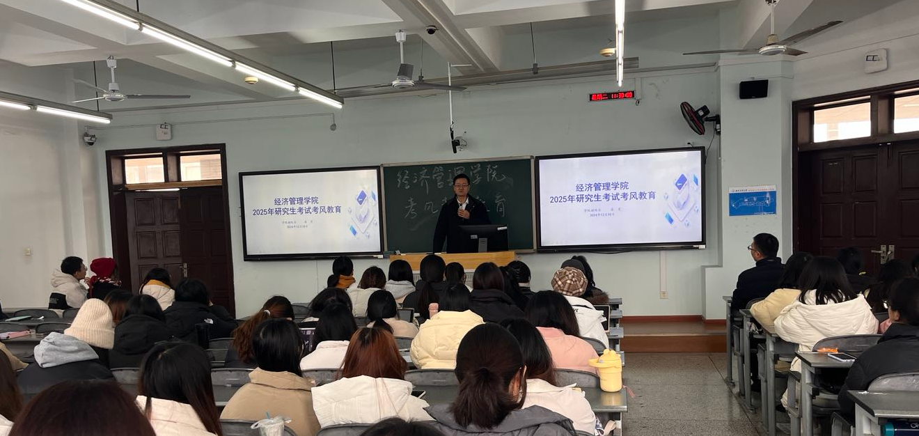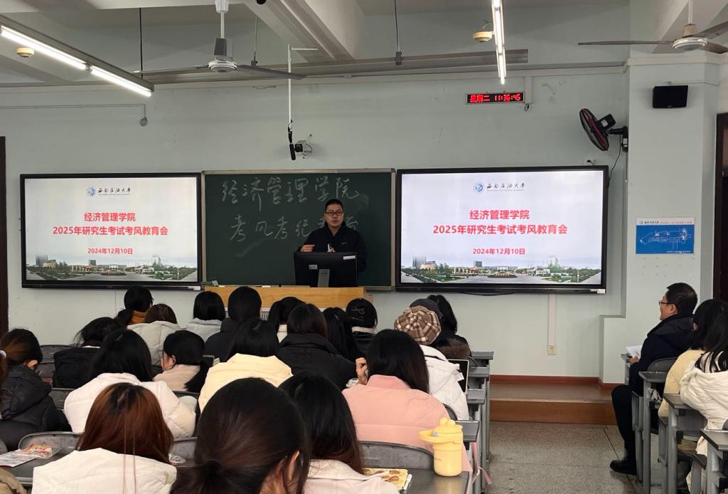 12月10日,经济管理学院为150余名考生开展考风考纪教育。经管院副院长苏昊传达教育部、四川省、学校研究生招生考试工作会议精神,并对学院考务工作进行了安排布置。党委副书记、纪委书记罗昌龙围绕考试纪律、考试要求、违纪案例进行了警示教育。