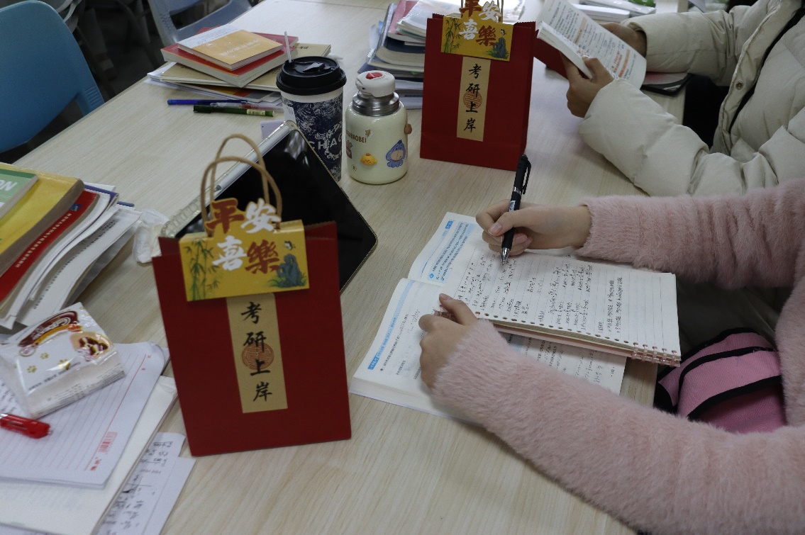 学院也专门安排考研帮扶团成员前往实验室、自习室、图书馆为尚在备考未能到场的同学们送去祝福。