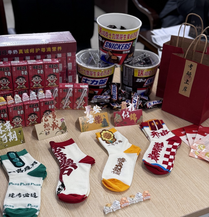 电信院为学生发放的“考研上岸加油包”中既有定制的上岸袜(印有“逢考必过”“金榜题名”“前程似锦”“一举夺魁”)、可爱举牌公仔(举有“加油”“开心”“好运”等祝福字样),又有暖宝宝、牛奶、糖果等物品。礼包凝结着学院对学子们深深的祝福,老师、学长学姐纷纷为考研学子书写祝福卡片,祝大家鱼跃龙门,成功上岸。