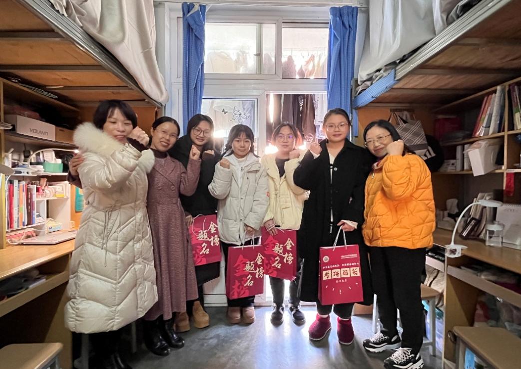 12月11日,外语院2021级辅导员詹芸和外语教研室教师代表前往宿舍和考研自习室为考研学子送上精心准备的礼物和衷心祝福。