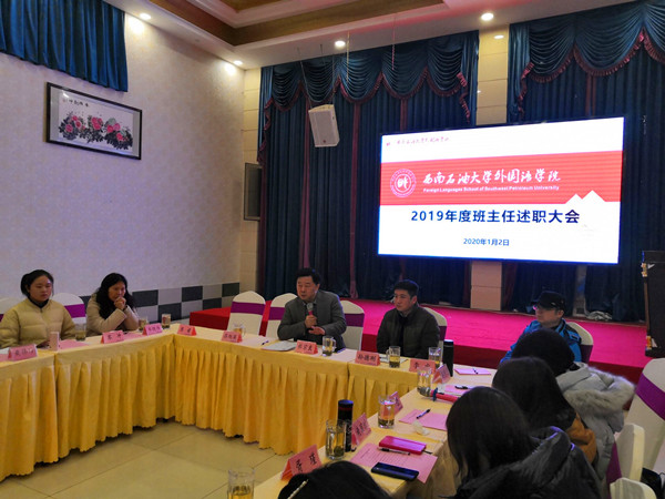 为建设一支师德师风高尚、业务水平突出、关心学生成长的班主任工作队伍,依据《西南石油大学外国语学院班主任工作条例》,1月2日下午,外国语学院顺利开展2019年度班主任述职大会。出席本次会议的人员有外语院党委书记杜宗良、外语院副院长(主持工作)吕旭英、外语院党委副书记孙德刚、外语院副院长李虎、外语院副院长陈婧、英语专业教研室主任阮先玉、俄语专业教研室主任杨丽新,以及全院各班班主任、辅导员。会议由外国语学院党委副书记、纪委书记孙德刚主持。