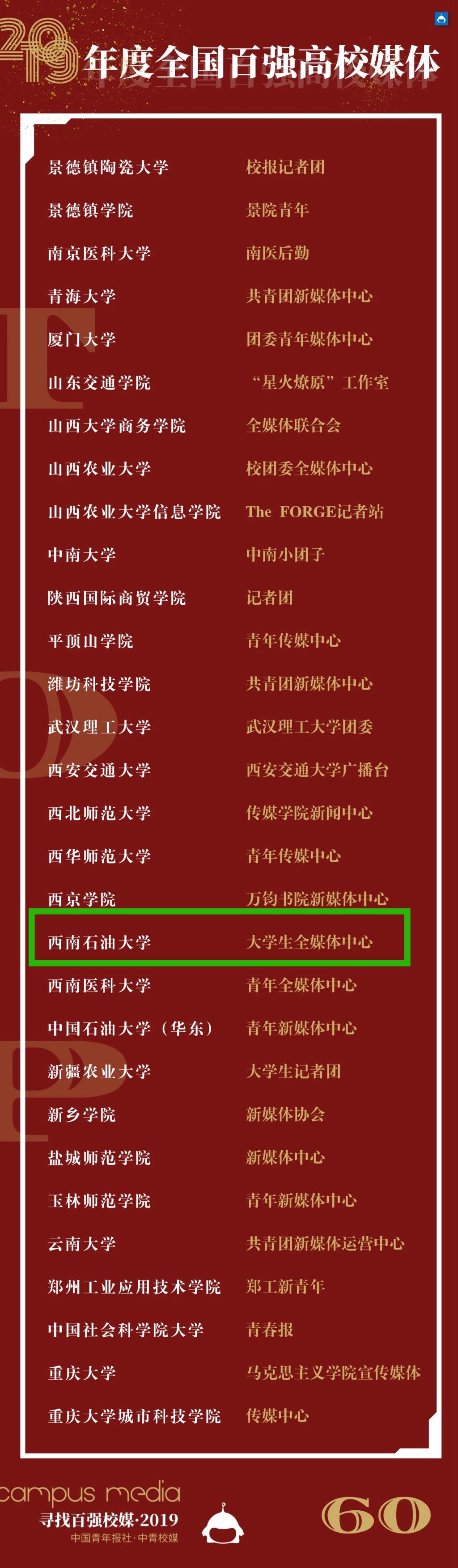 近日,由中国青年报社、中青校媒主办的“我们要寻找你们——2019年度全国百强校园媒体!”活动成功举行。网络公布了2019年度获奖名单,我校大学生全媒体中心获评2019年度全国百强校园媒体。