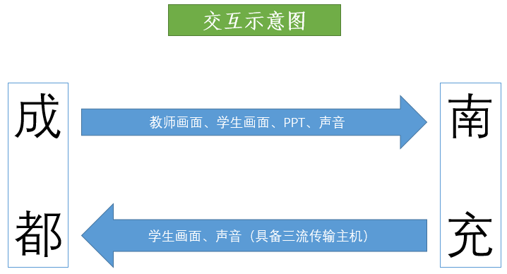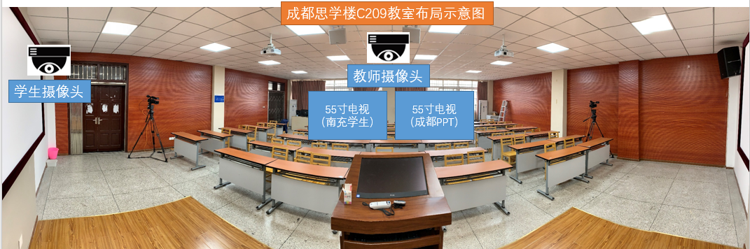 远程教学互动系统分别建设在南充校区4316教室和成都校区思学楼C209教室,系统通过远程教学互动软硬件实现两校区的教学互动。南充校区可以通过互动教室共享成都校区的优质教师资源。教师也无需奔波于南充和成都,节约了交通成本,通勤时间。