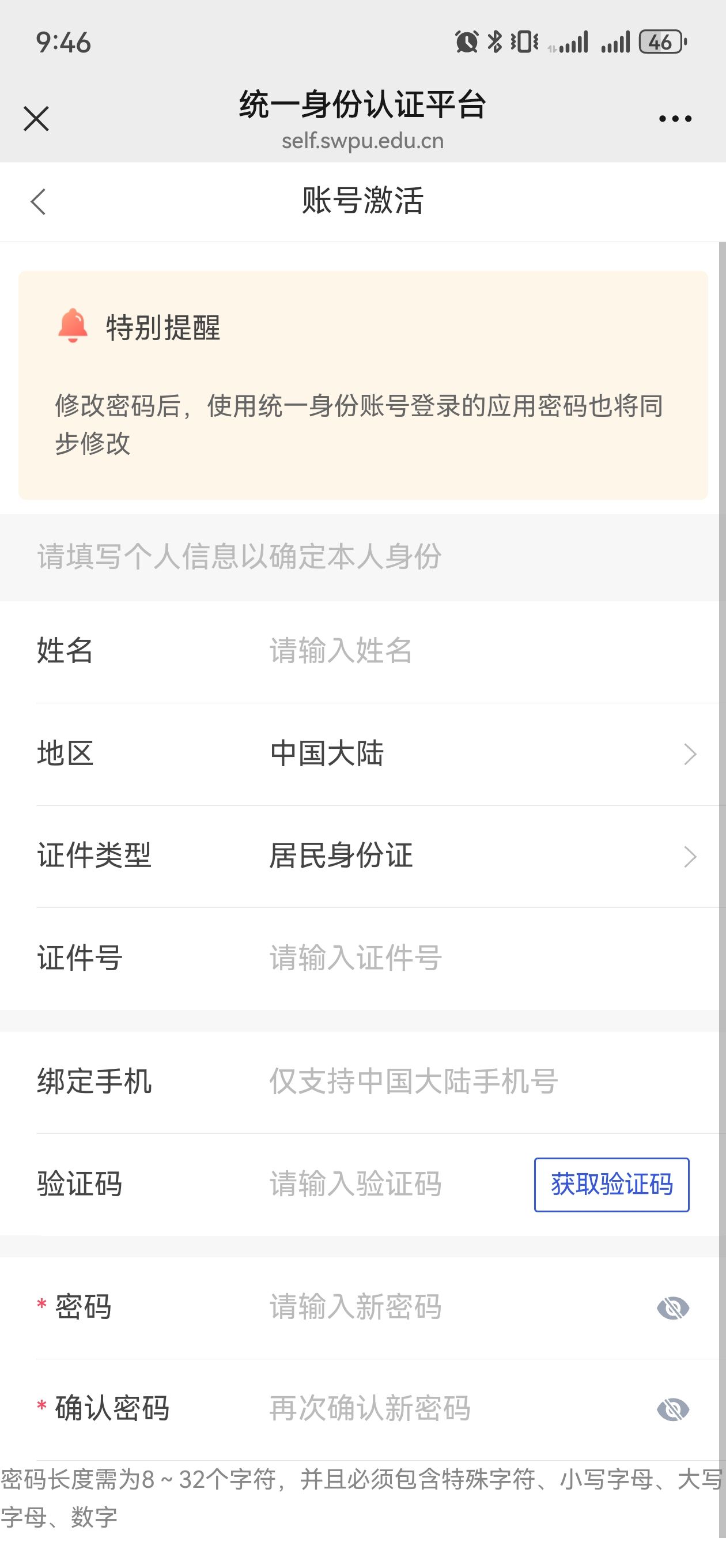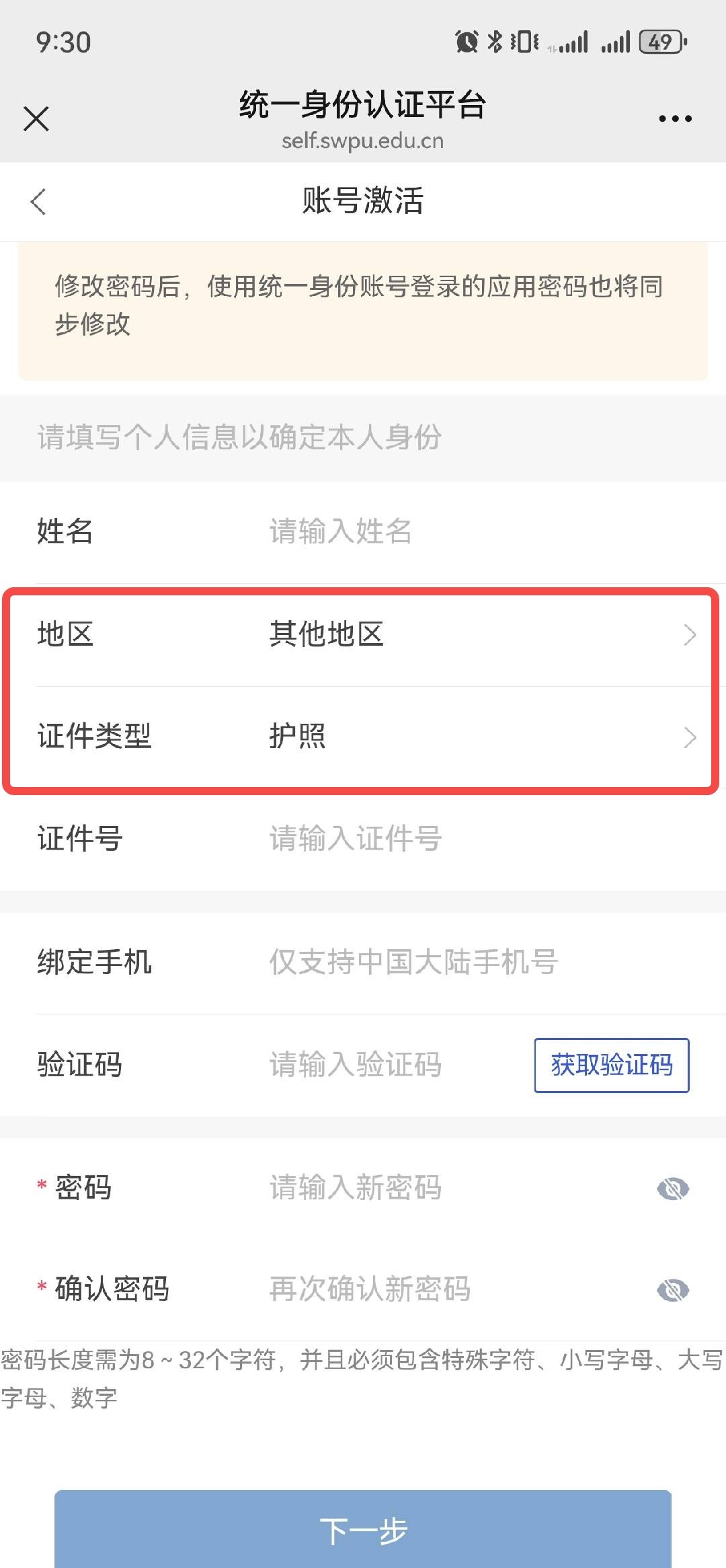 注意:国际留学生将地区选为“其他地区”,证件类型选为“护照”(留学生填写完成这一步即可激活账号)
