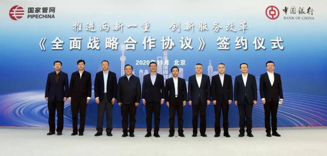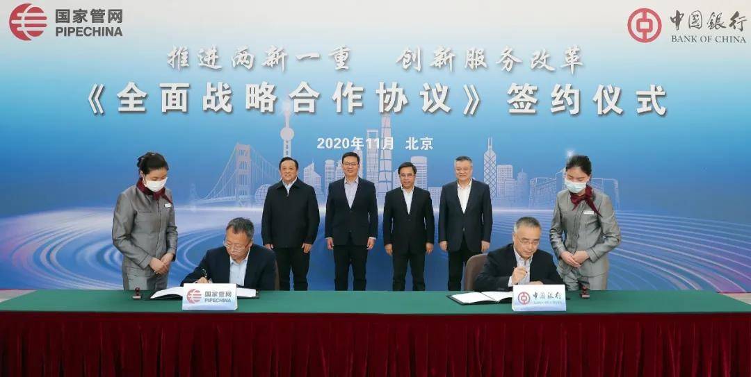 11月26日,国家管网集团与中国银行以“推进两新一重·创新服务改革”为主旨签订《全面战略合作协议》。国家管网集团董事长、党组书记张伟,总经理、党组副书记侯启军,中国银行董事长、党委书记刘连舸,行长、党委副书记王江出席仪式。国家管网集团总会计师、党组成员王德华,中国银行副行长、党委委员王纬代表双方签约。