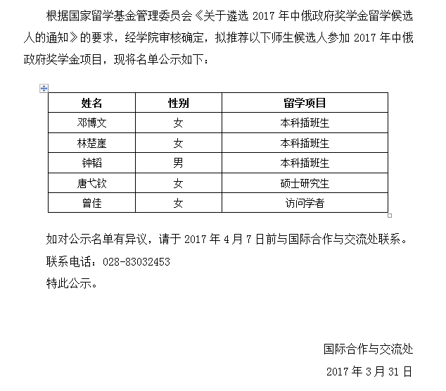关于2017中俄政府奖学金项目师生推荐名单的公示