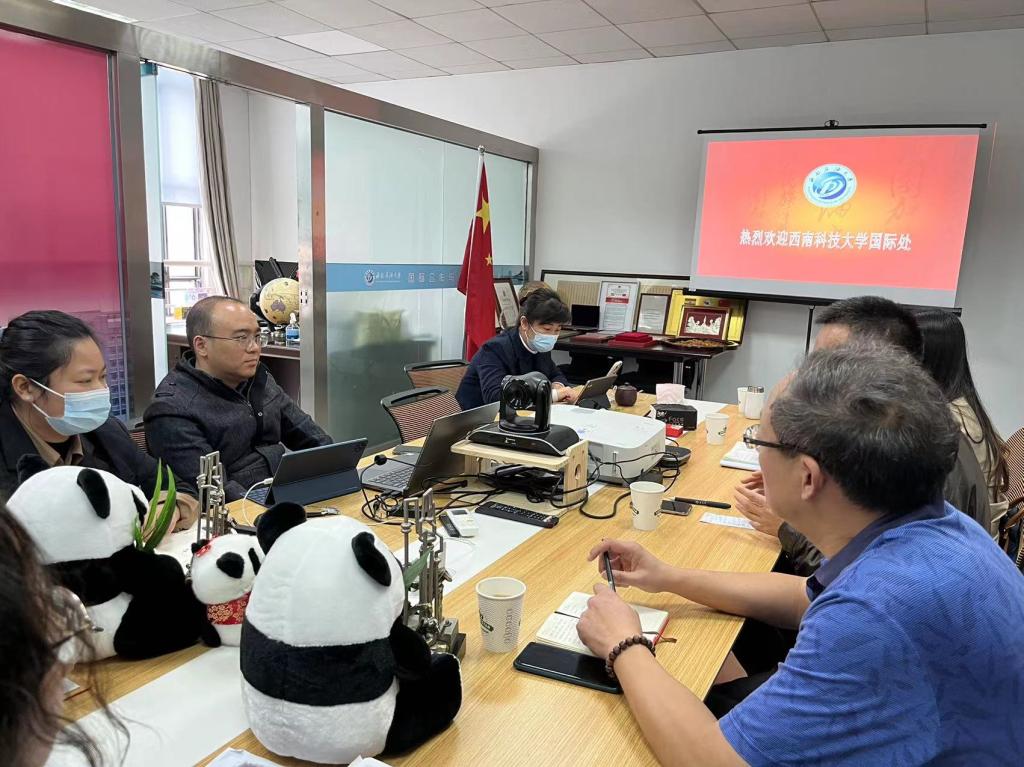 2022年11月9日上午,西南科技大学国际合作与交流处处长张贯之一行4人来校开展调研交流。学校国际合作与交流处相关人员参加了座谈会与调研活动。座谈会由国际合作与交流处处长戴磊主持。