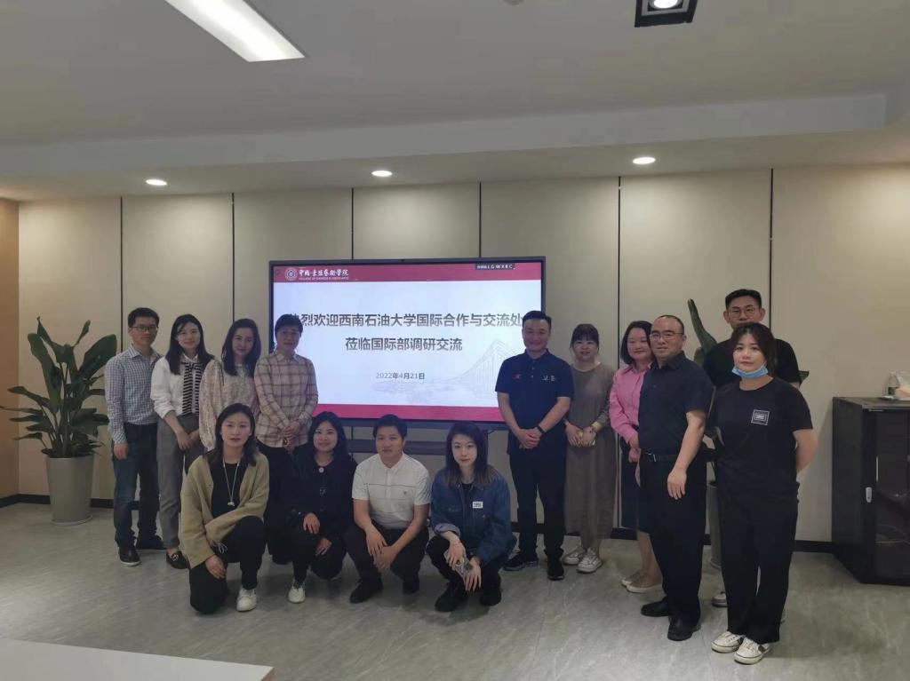 4月21日下午,西南石油大学国际合作与交流处处长戴磊,副处长李小刚一行赴成都大学中国-东盟艺术学院国际部学习调研,成都大学中国-东盟艺术学院国际部主任冉毅嵩、副主任万群及相关科室负责人参与调研。