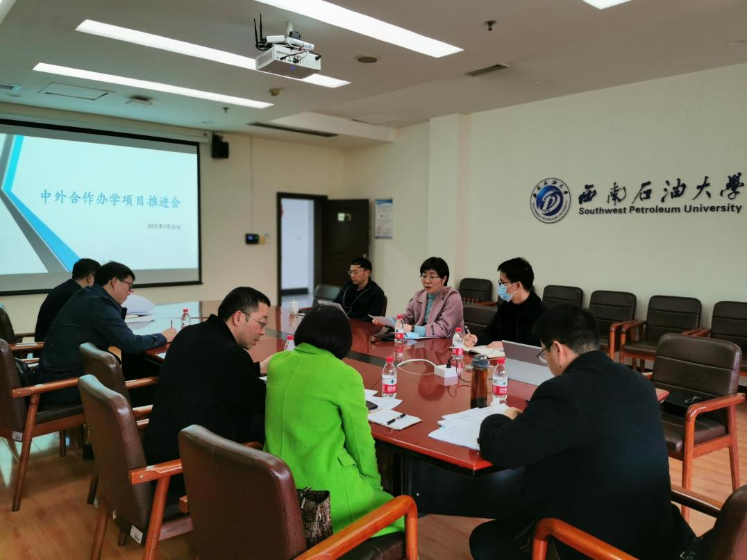 2021年3月26日,西南石油大学与美国明尼苏达州立大学曼卡托分校中外合作办学项目推进会在办公楼209召开,副校长张烈辉,教务处副处长周东华、财务处副处长肖鹏、科长黄清、机电工程学院副院长韩传军、副教授蒋发光,国际处处长戴磊以及国际处相关负责老师一同参加了会议。