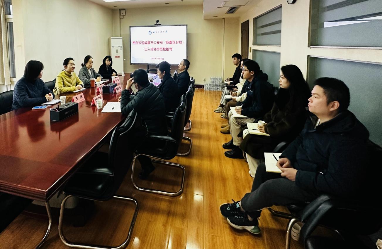 12月15日上午10:00,成都市公安局出入境管理大队副大队长廖华夏带队来校调研。成都市公安局新都区分局出入境管理大队大队长刘灿参加调研。我校国际合作与交流处处长戴磊、学生工作处副处长张浩、保卫处副处长江波在办公楼709会议室与廖华夏一行进行了座谈交流。