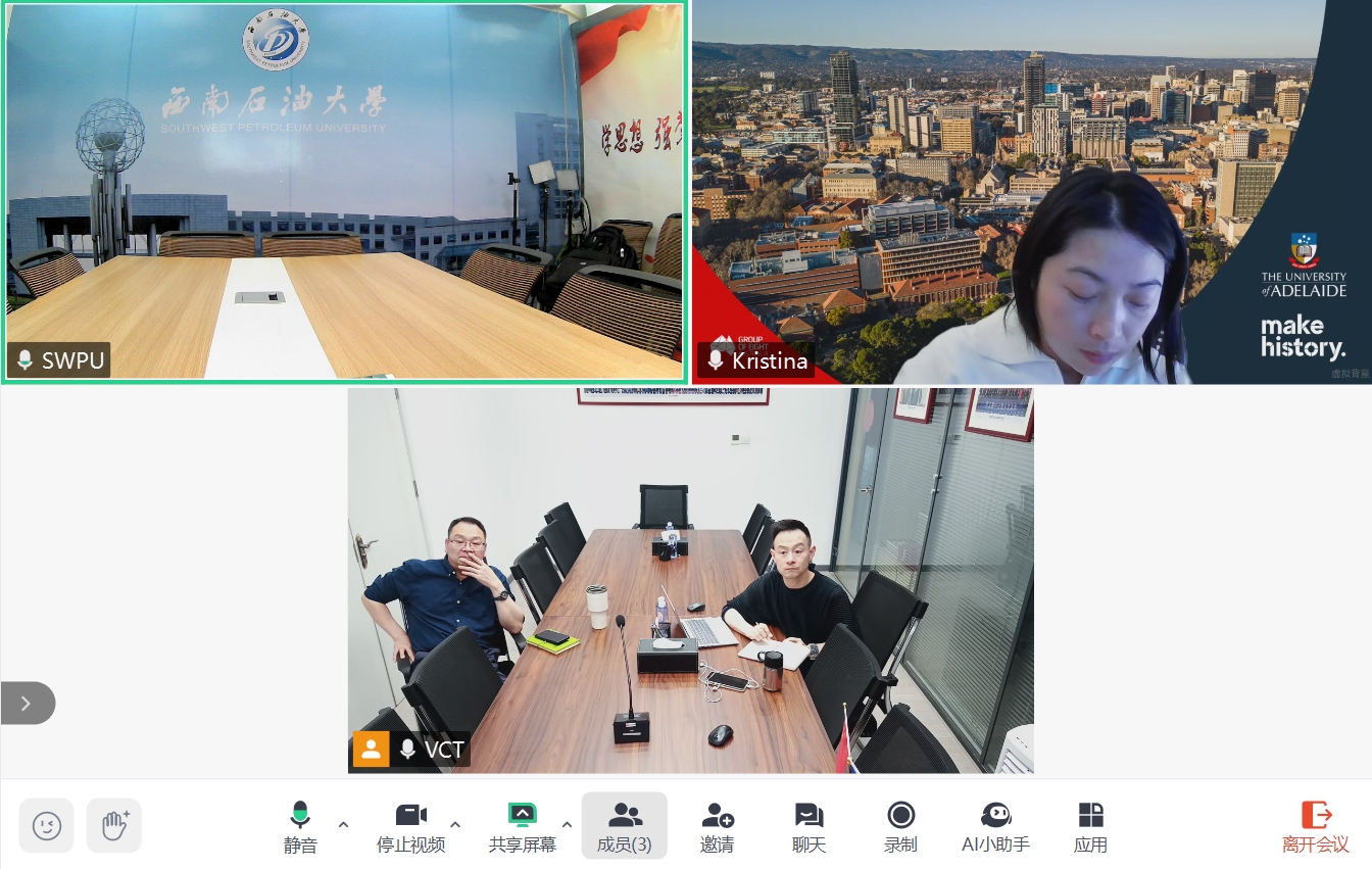 4月21日,我校与澳大利亚阿德莱德大学举行线上合作洽谈会,围绕师生短期交流访学、共建实验室、参加中国政府奖学金来华访学、硕士预科班等议题进行深入探讨并达成共识。双方将尽快落实签署合作备忘录,推动项目实质落地。阿德莱德大学国际处招生办公室Kristina、北美通识国际教育咨询(北京)有限公司副总裁黎伟和西南石油大学国际合作与交流处处长戴磊等参加会议。