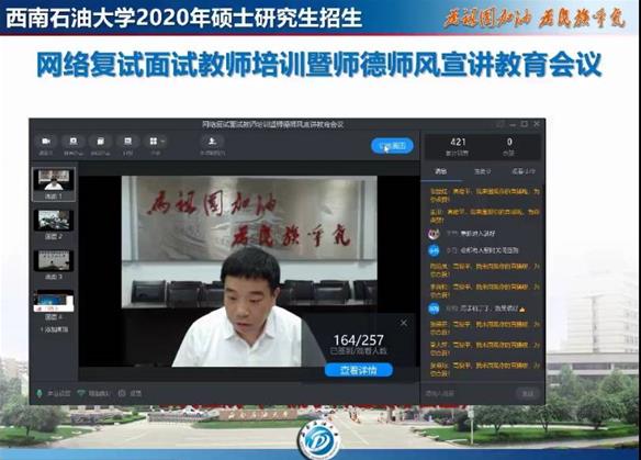 5月14日下午,学校召开网络复试面试教师培训暨师德师风宣讲教育会。根据疫情防控需要,培训会采取“线上线下”相结合的方式,主会场设在图书馆楼C610,由副校长、研究生招生工作领导小组副组长郭建春主持,纪委、教师工作部、保密办、研究生院相关人员参加;研究生招生学院院长、副院长、秘书,全体面试教师共计458人通过钉钉直播平台同步在线参加培训。请假人员在会后通过观看直播回放接受培训。