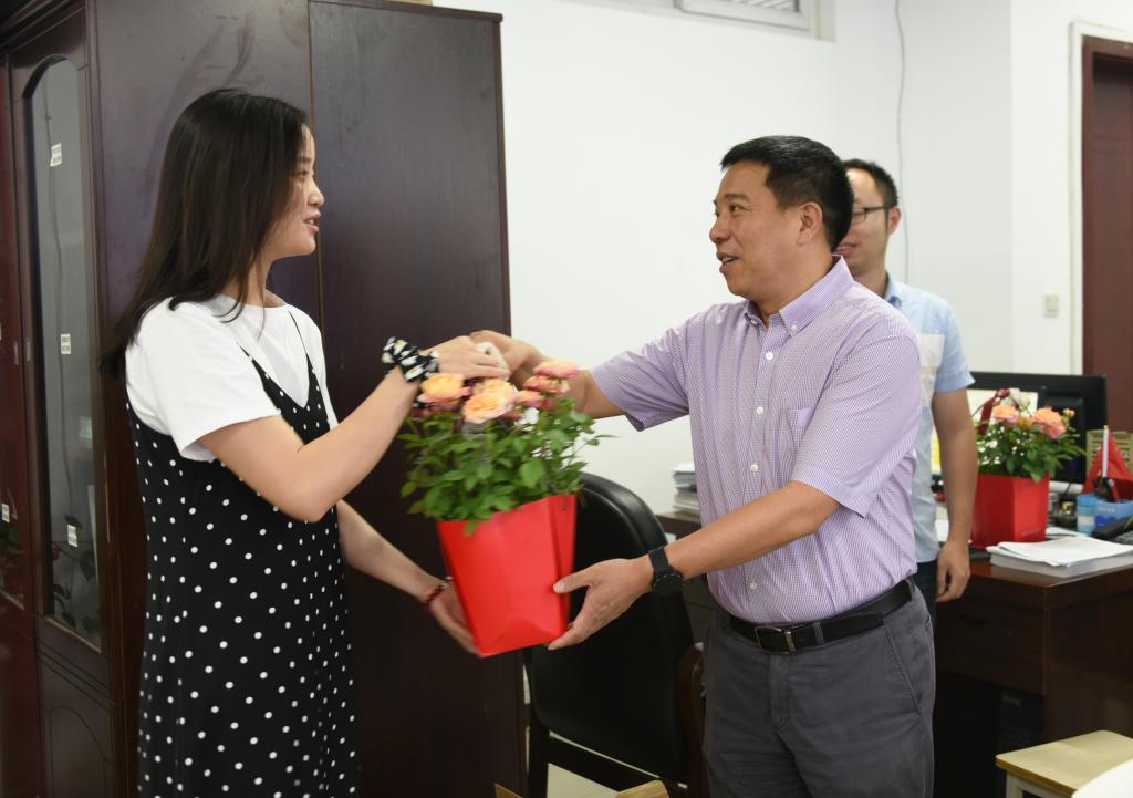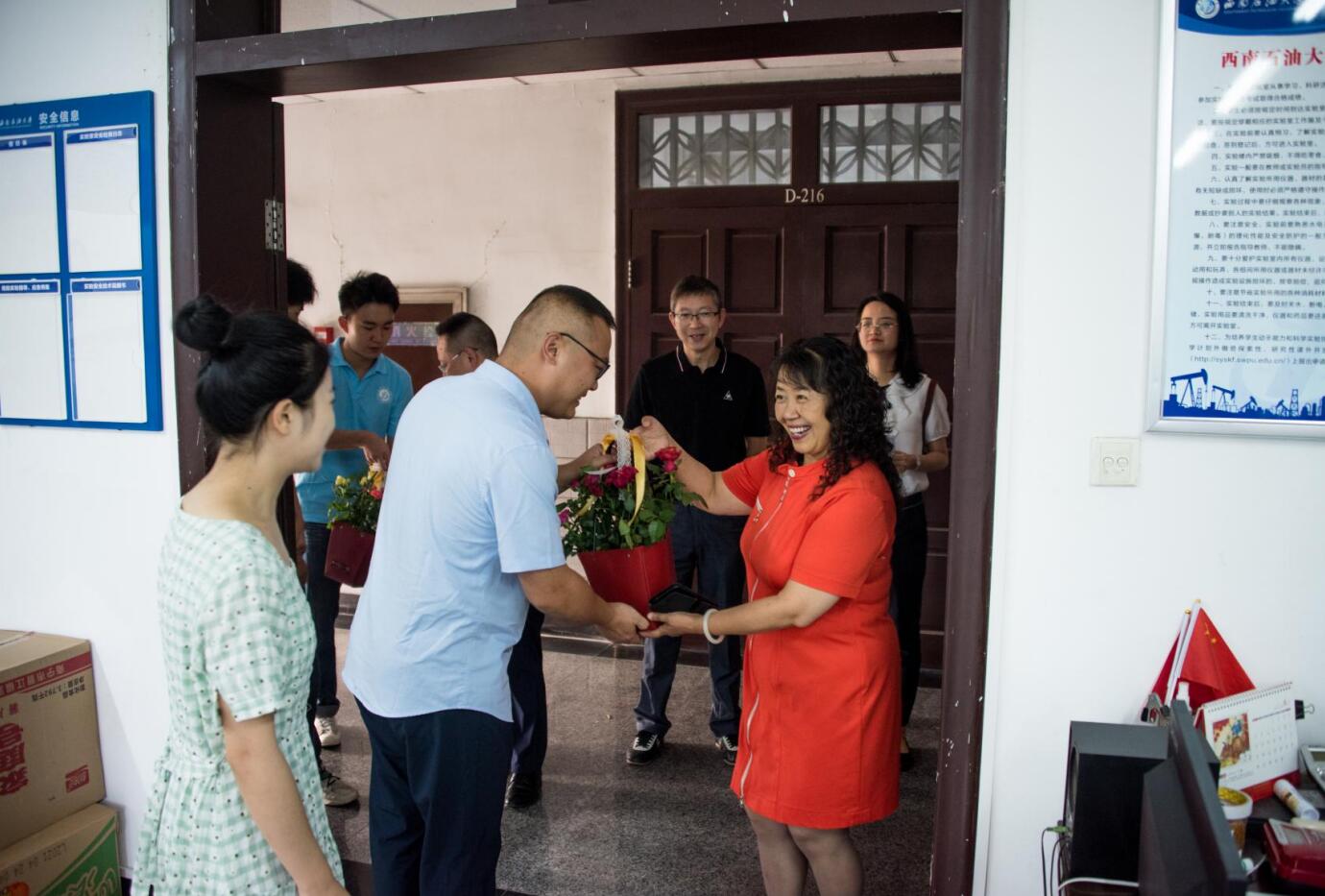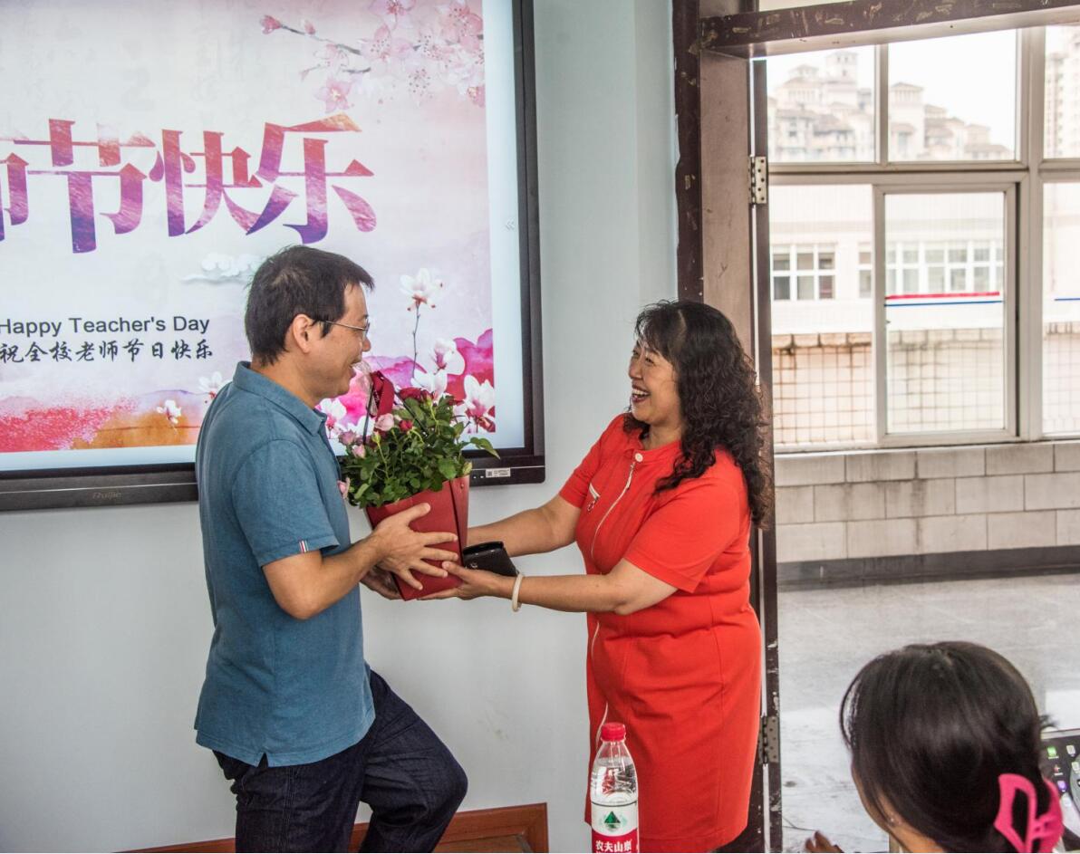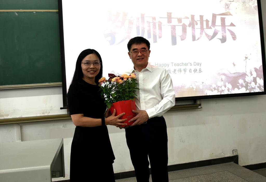 党委常委、副校长郭建春走进明理楼,与老师们一一握手,献上鲜花,嘱托他们保重身体,用爱和责任肩负起教书育人的重托。