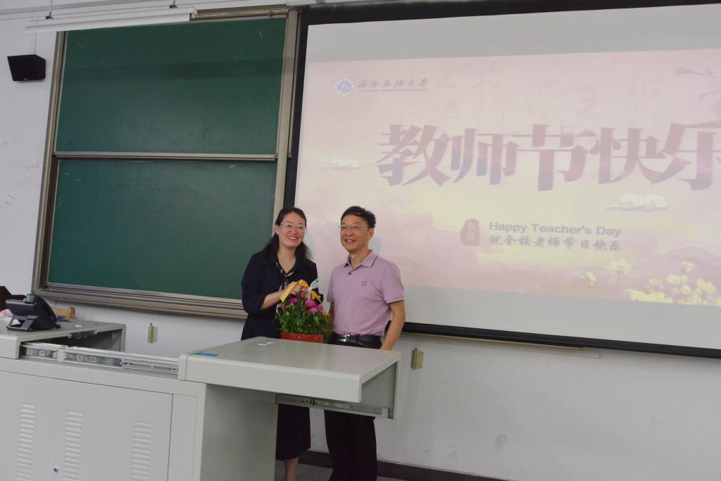 校党委副书记、纪委书记郭世一走进地科院教室,为正在进行课前准备的老师们送去节日的祝福,并邀请同学们共同祝愿老师“教师节快乐”。