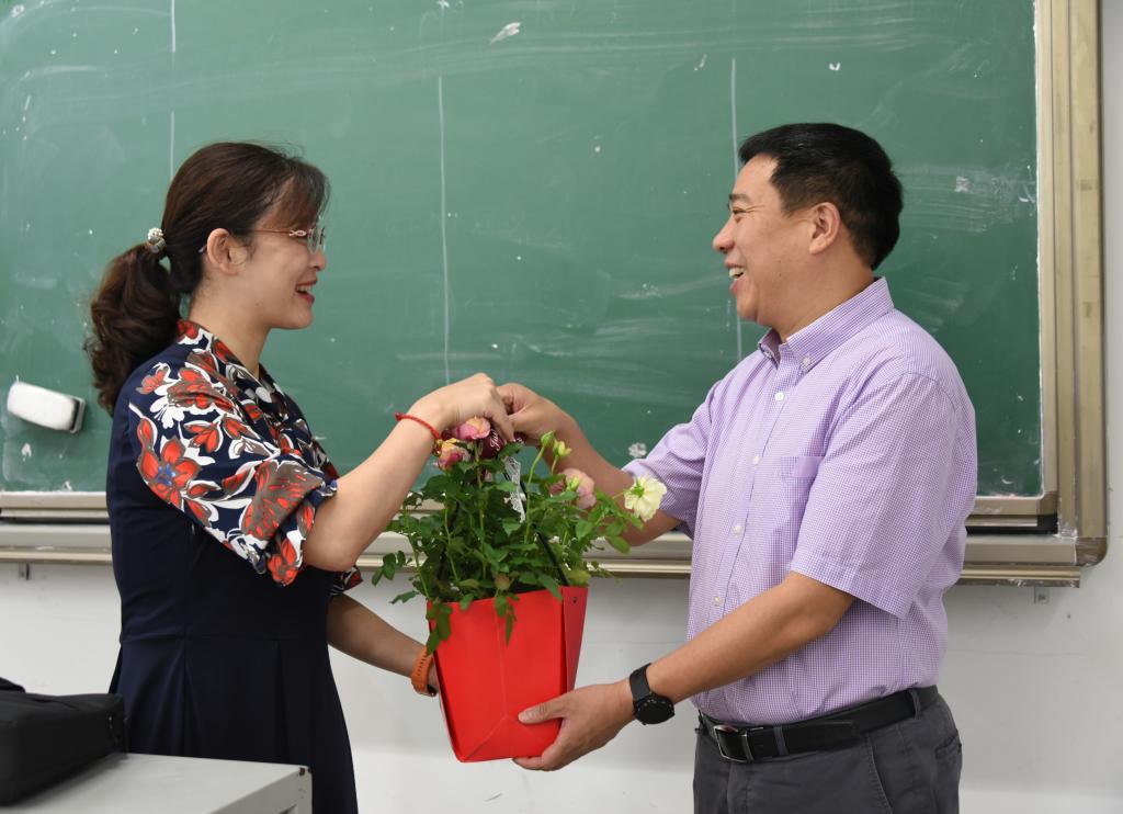 党委常委、副校长刘向君走进博学楼,为老师们送上鲜花的同时,叮嘱同学们努力学习,不负师恩。