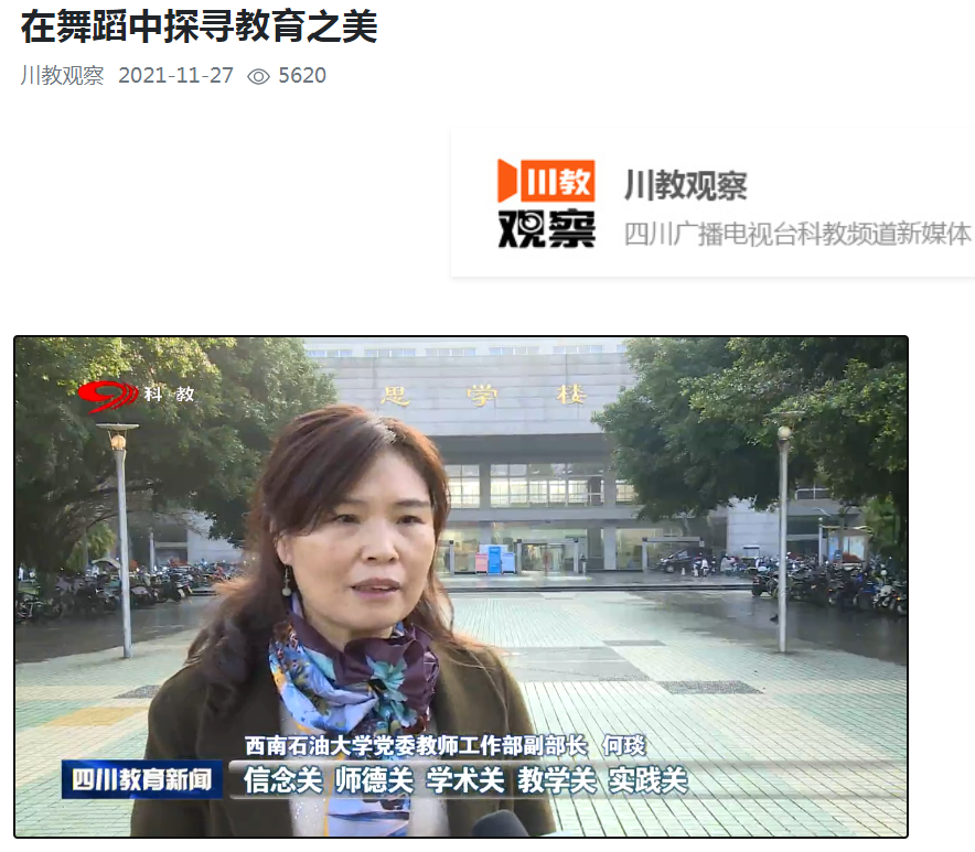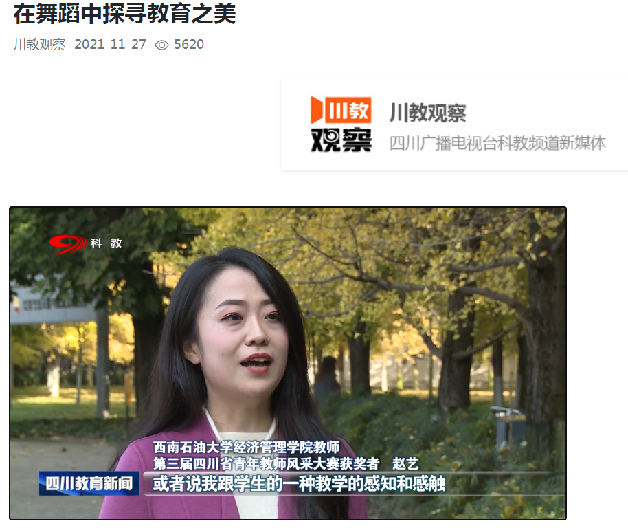 近日,四川广播电视台科教频道以《在舞蹈中探寻教育之美》为题,对第三届四川省青年教师风采大赛获奖代表、我校经济管理学院教师赵艺的教书育人事迹和我校青年教师“过五关”计划的培养模式进行了专题报道。