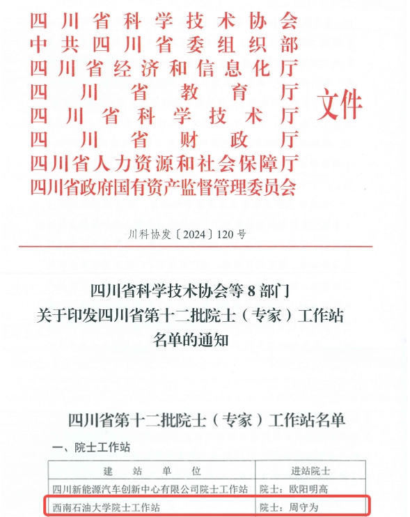 我校获批院士工作站以实现非常规油气开发理论创新和攻克关键瓶颈技术、打造高素质人才队伍为宗旨,进站院士为中国工程院周守为院士。自2021年筹备建站以来,学校与周守为院士及其团队合作获批国家级平台2个,取得多项重大技术成果和科技奖项,为国家、四川省油气产业高质量发展和学校“双一流”建设作出了重要贡献。