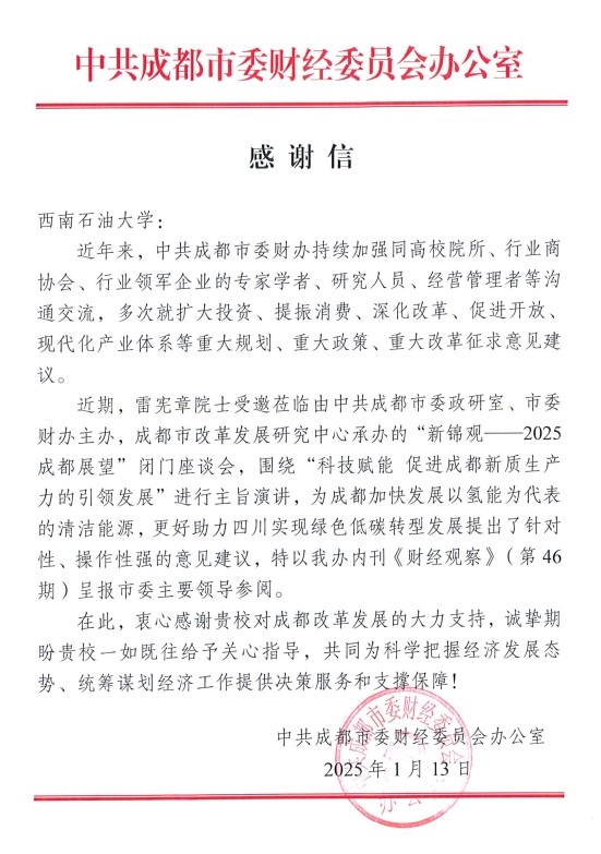 信中谈到,雷宪章院士受邀莅临由中共成都市委政研室、市委财办主办,成都市改革发展研究中心承办的“新锦观--2025成都展望”闭门座谈会,围绕“科技赋能促进成都新质生产力的引领发展”进行主旨演讲,为成都加快发展以氢能为代表的清洁能源,更好助力四川实现绿色低碳转型发展提出了针对性、操作性强的意见建议。希望学校与中共成都市委财经委员会共同为科学把握经济发展态势、统筹谋划经济工作提供决策服务和支撑保障。