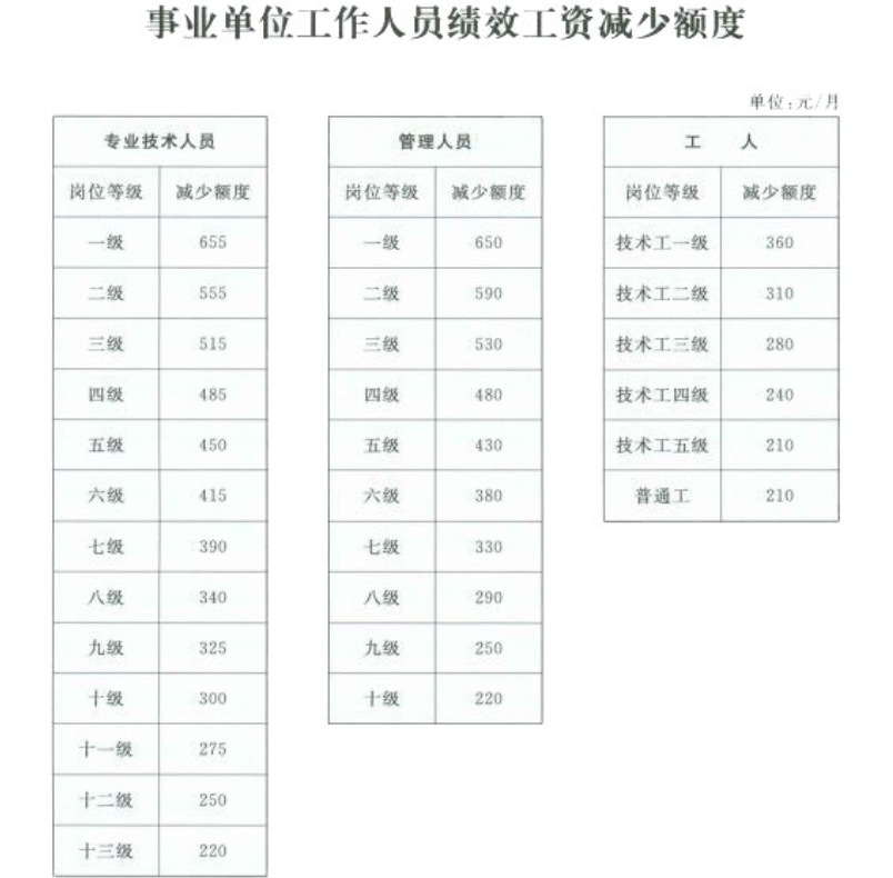 在2015年3月调整月预发绩效的基础上,各单位参照《人社厅、财政厅关于调整事业单位工作人员基本工资标准的实施意见》(以下简称《实施意见》)中的(附表4)《事业单位工作人员绩效工资减少额度》,自主调整本单位职工绩效工资按月预发额度。