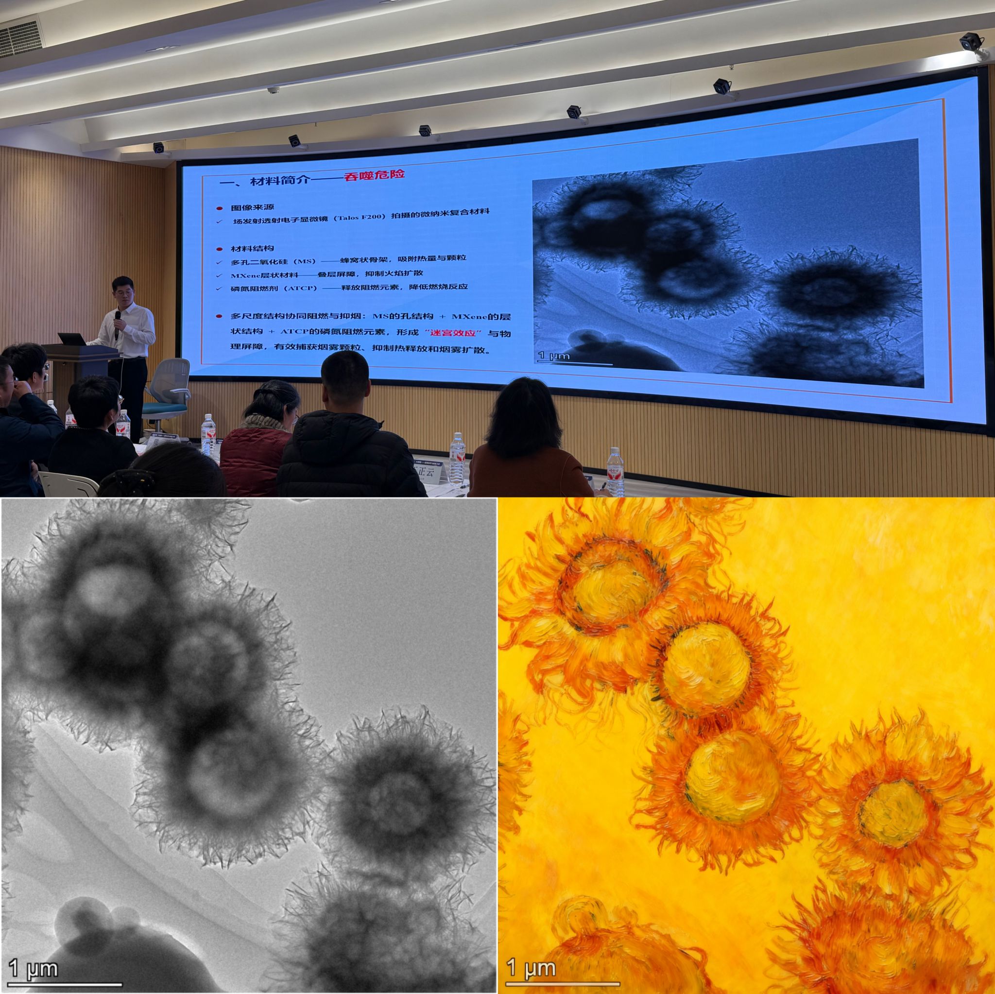 该获奖作品使用我校分析测试中心的场发射透射电子显微镜Talos F200拍摄,直观呈现了具有协同阻燃与抑烟功能的多尺度复合材料结构。作品巧妙融合了多孔二氧化硅(MS)的蜂窝状骨架、MXene的叠层屏障以及磷氮阻燃剂(ATCP)的元素释放,三者协同形成“迷宫效应”与物理屏障,有效捕获烟雾颗粒、抑制热释放与火焰扩散。