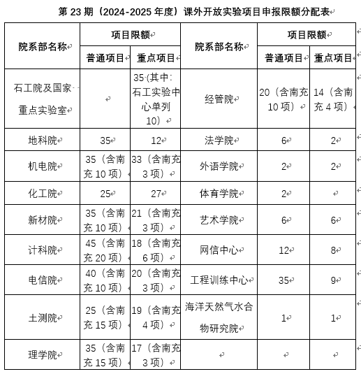 第23期(2024-2025年度)课外开放实验项目申报限额分配表