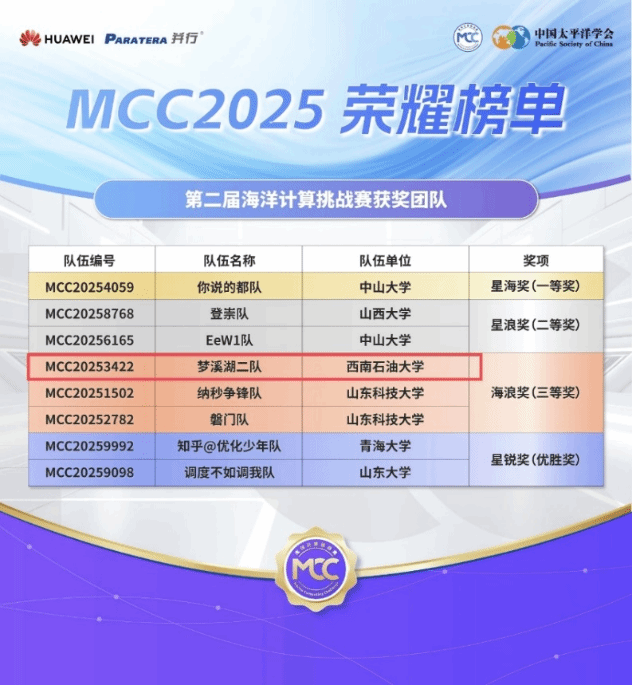2025 年海洋计算挑战赛(MCC)总决赛颁奖仪式于 11 月 6 日在贵州省贵阳市隆重举行。我院超算与并行团队 “梦溪湖二队” 凭借扎实的海洋数值模拟功底与卓越的并行优化实力,在“妈祖・海浪模式”与“全球及中国近海生态环境要素智能预测”双赛道中脱颖而出,斩获全国三等奖(海浪奖)。