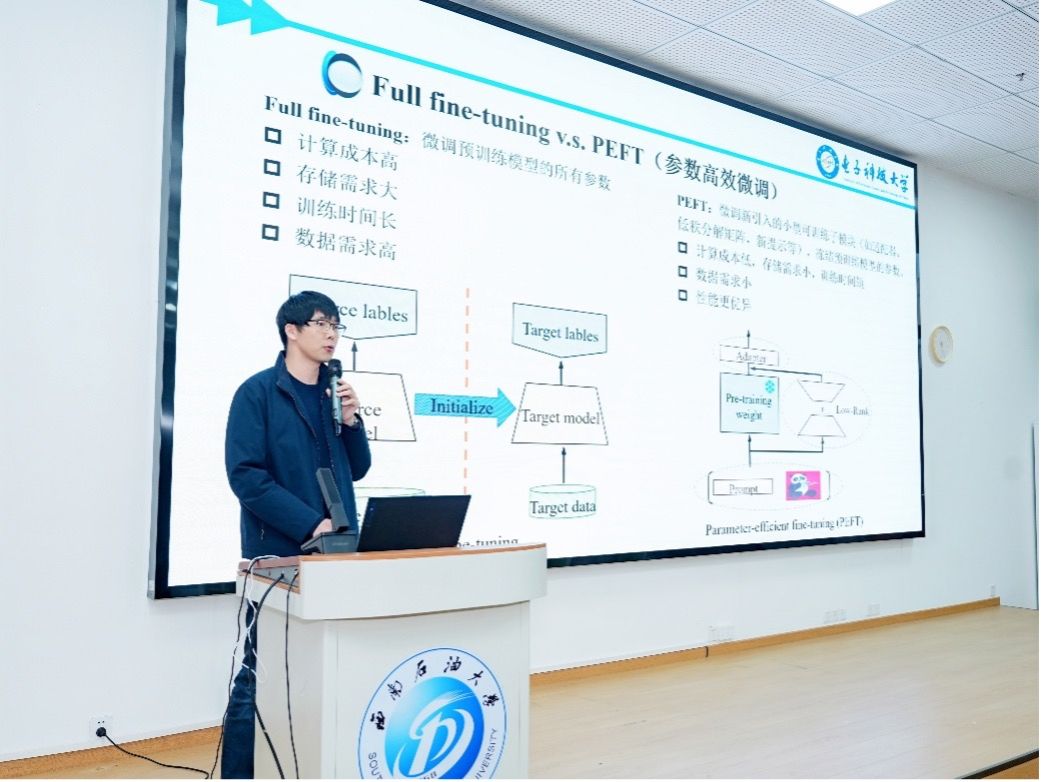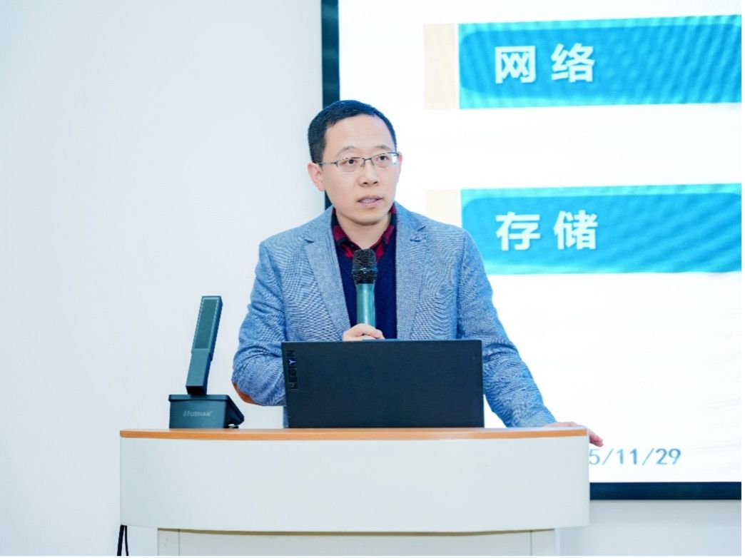 在主题报告环节,八位专家学者进行了精彩纷呈的学术分享。本环节由学院副院长彭博教授主持。西南交通大学计算机与人工智能学院院长李天瑞教授,四川大学计算机学院副院长郭兵教授,超聚变HPC市场代表张环宇,清华大学计算机系长聘教授、CCF高专委副主任翟季冬教授,四川大学信息化建设与管理办公室主任段磊教授,北京大学计算中心系统管理室副主任李若淼高级工程师,电子科技大学计算机科学与工程学院海外优青王鹏教授分别作 “面向可持续城市的智能化技术应用案例”、“嵌入式系统的低能耗软件设计方法及实现”、“超聚变算力服务构建教育科研算力底座”、“面向国产智能算力核心基础软件”、“面向AI for Science 的高校算力建设策略思考”、“北京大学算力实践”、“基于矩阵低秩分解的视觉预训练模型高效微调”报告,共同探讨在大模型推动算力需求指数级增长的背景下,高校算力建设和服务正在经历的变革,探寻校级计算平台的可持续发展之路,以及AI大模型技术如何助力师生深入探索科研与教学创新,为教学开启了全新范式,实现算力、模型与应用的深度融合。