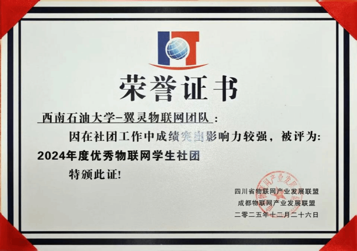 此外,物联网工程教研室周文俊老师荣获“2024年度四川省优秀物联网教师”称号,翼灵物联网社团及其会长洪艺婷同学也分别荣获优秀社团与优秀会长荣誉。