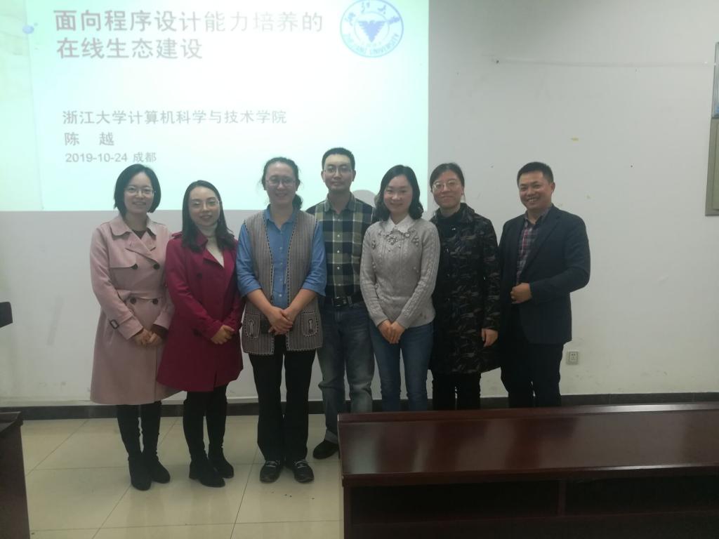 在讲座中陈越教授根据自身在MOOC教学和在线实验平台开发等方面的工作实践,综述当前在线实验平台的开发与应用现状,以程序设计能力培养体系的构建为例,就普适、普惠性的在线开放教学资源的建设、维护与共享模式设计提出自己的看法。讲座后,参会老师积极和陈老师进行交流,就专业人才培养方案、程序设计类课程教学,PTA平台的使用,以及天梯赛等问题展开了深入讨论,陈老师给出了自己的建议和意见。