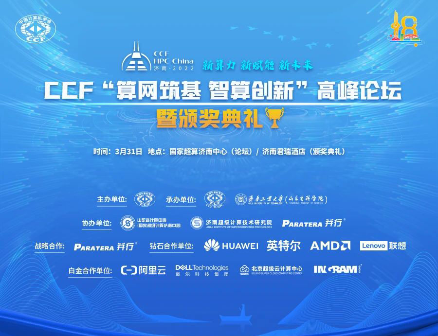 2023年3月31日,CCF“算网筑基,智算创新”高峰论坛暨颁奖典礼在国家超级计算济南中心举行。本次活动由中国计算机学会主办,中国计算机学会高性能计算专业委员会、齐鲁工业大学(山东省科学院)承办,山东省计算中心(国家超级计算济南中心)、济南超级计算技术研究院、北京并行科技股份有限公司协办。来自全国各地的高性能计算领域的专家、学者、企业代表和获奖队伍参加了本次活动。