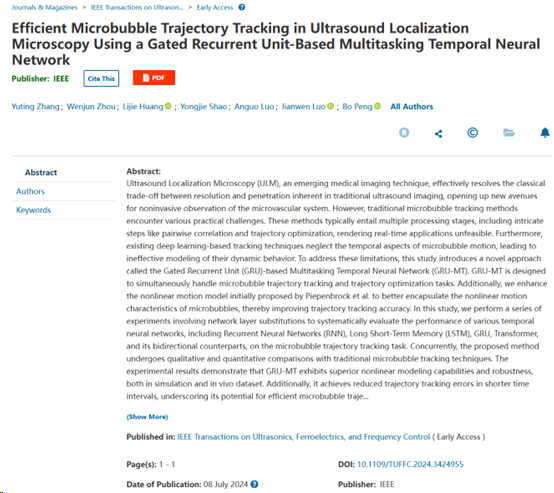 近日,我院在超声超分辨率成像研究中取得新进展,学院图像处理与并行计算实验室2022级硕士生张玉婷作为第一作者的论文“Efficient Microbubble Trajectory Tracking in Ultrasound Localization Microscopy Using a Gated Recurrent Unit-Based Multitasking Temporal Neural Network”在《IEEE Transactions on Ultrasonics, Ferroelectrics, and Frequency Control》期刊上发表,我院彭博教授、清华大学罗建文教授(教育部长江学者特聘教授)为共同通讯作者,我院周文俊博士、2020级硕士生邵永杰(已毕业)、四川省人民医院罗安果副主任医师和清华大学黄俐杰博士也参与了该项课题的研究。IEEE T-UFFC是IEEE UFFC协会的旗舰期刊,也是超声成像领域的权威期刊,目前为中科院二区期刊,2024年最新影响因子为3.63。这是该团队继2023年后再次在该刊发表论文,论文经过两次大修和一次小修,最终长度达21页。论文链接:https://ieeexplore.ieee.org/document/10589426。代码链接:https://github.com/zyt-Lib/GRU-MT。