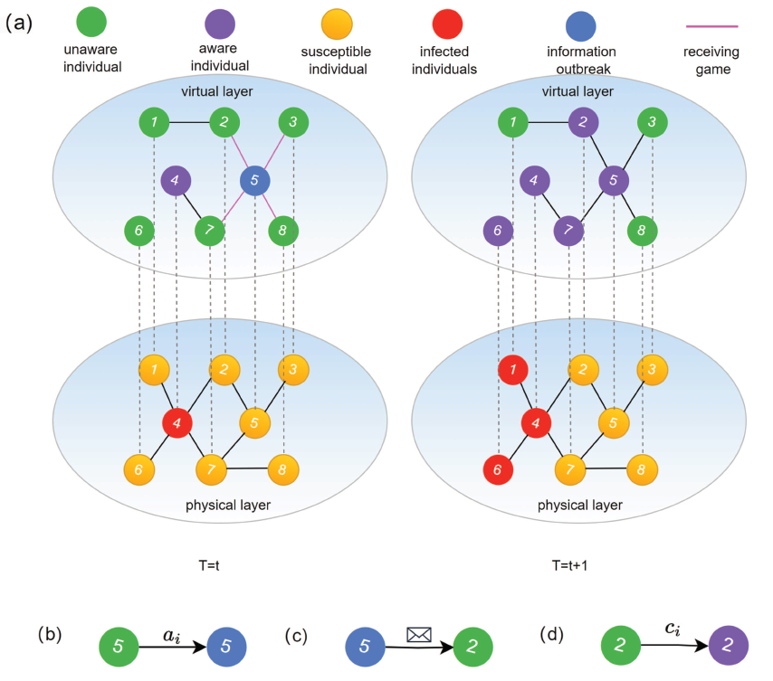 硕士生何昊星在《Chaos: An Interdisciplinary Journal of Nonlinear Science》发表学术论文“Epidemic spread dynamics in multilayer networks: Probing the impact of information outbreaks and reception game”。论文基于现实世界中的信息爆发传播和接收博弈现象,构建了具有信息爆发和信息接收博弈的多层网络病毒传播模型;通过微观马尔科夫(MMC) 方法推导了网络的传播动力学方程;分析了信息爆发、信息接收成本、信息扩散率、信息遗忘率和网络结构等因素对病毒传播的影响。研究发现,信息爆发能有效抑制病毒的传播,而信息接收成本升高则促进了病毒的扩散;网络的异质性对抑制病毒感染规模起到了关键作用,网络异质性越大越有利于病毒防控;真实数据集上的实验结果验证了其方法在实际场景中的有效性。论文链接:https://doi.org/10.1063/5.0236359