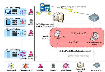 硕士生张翀(导师:张晓均)在中科院1区TOP期刊Information Fusion发表学术论文“Poisoning attacks resilient privacy-preserving federated learning scheme based on lightweight homomorphic encryption”, 该期刊是计算机科学和人工智能领域的国际顶级期刊,2025年最新影响因子14.8。论文链接:https://www.sciencedirect.com/science/article/abs/pii/S1566253525002040?via%3Dihub。该论文面向隐私敏感的智能联邦学习系统,设计了一种融合轻量级同态加密与异常检测机制的抗投毒隐私保护方案。利用对称同态加密算法实现加密下的高效梯度聚合,保护客户端本地梯度隐私,避免明文泄露带来的数据重构风险。同时,采用基于范数距离的异常检测算法识别恶意客户端上传的梯度模型,通过调整其聚合权重,抵御模型投毒攻击。并引入了基于椭圆曲线的数字签名算法保障传输信息的完整性,支持聚合过程可验证。安全性分析与性能评估进一步证明,该方案在轻量计算成本下实现了联邦学习中的隐私保护与安全防御目标。