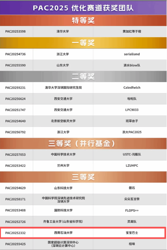此次获奖不仅是对团队数月努力的肯定,更是西南石油大学高性能计算人才培养质量的生动体现。这一成果与我校近期获评中国高校算力优秀案例、在国产CPU并行应用挑战赛中屡获佳绩等成果相辅相成,凸显了学校在计算机学科建设与实践教学方面的扎实基础。高性能计算中心提供的尖端设备支持,计算机与软件学院教师的系统培养,以及张全、彭博等指导教师的悉心指导,共同为团队成长搭建了优质平台。