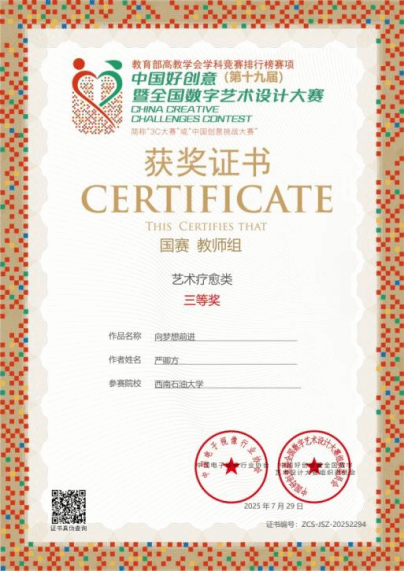 我院严卿方老师的动画作品通过动画关键帧技术表现动画角色经历困境重拾信心战胜困难的故事,获得国赛(教师组)三等奖。