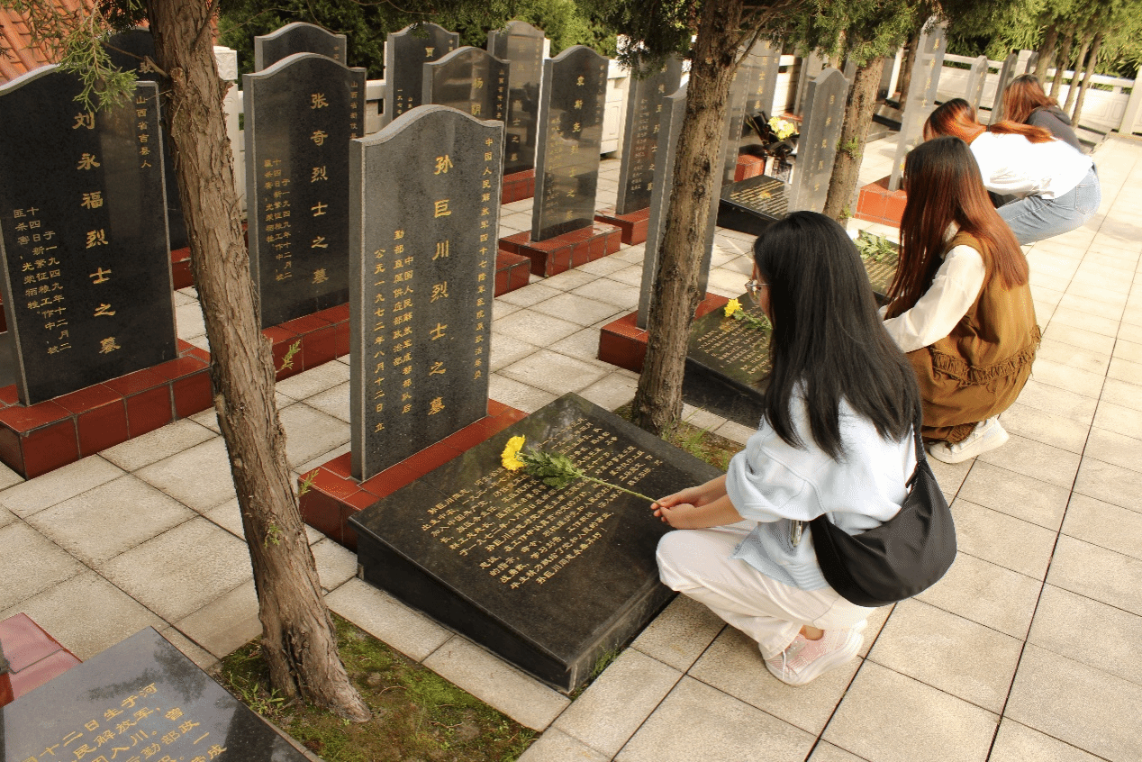 在深入了解烈士们的丰功伟绩后,同学们自发地走到烈士墓前,深深鞠躬,并将手中的菊花轻轻献上。一束束鲜花,寄托着后辈对先烈的无限哀思和崇高敬意。画面中,前景鲜黄的菊花与背景洁白雄伟的纪念碑相互映衬,象征着革命精神生生不息、永续传承。