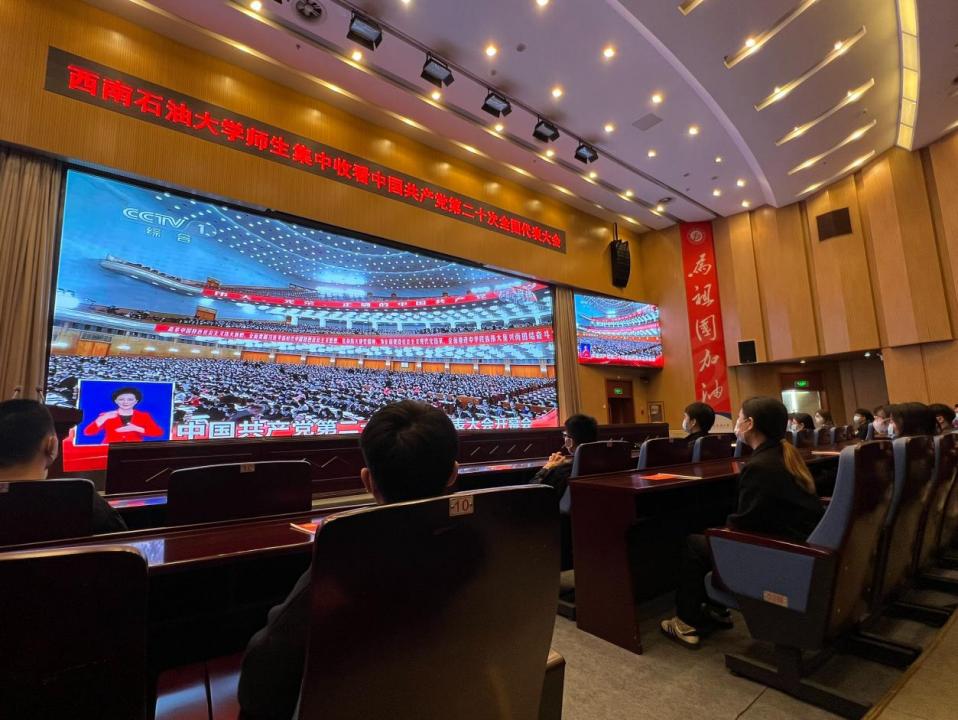 学校图书馆报告厅,学校领导、师生代表按照疫情防控要求,收看二十大开幕盛况