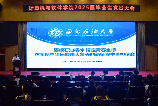 大会第二项,学院党委书记李涧松以“赓续石油精神、锚定青春坐标”为主题发表讲话,激励广大青年在实现中华民族伟大复兴的新征程中勇担使命。李书记回顾了中国式现代化的提出历程,强调其五大特征:人口规模巨大、全体人民共同富裕、物质文明与精神文明协调、人与自然和谐共生、走和平发展道路。他指出,中国式现代化为人类社会发展提供了全新路径。在传承石油精神方面,李书记通过“压在车顶的煤气包”等生动故事,阐述了大庆精神的内涵,包括爱国主义、艰苦创业、求实精神和奉献精神。他介绍了西南石油大学的发展历程和成就,以及众多优秀校友的事迹。李书记还以计算机与软件学院为例,展示了学院在人才培养和科研创新方面的成果,鼓励毕业生党员树立远大理想,增强自身才干,成为具备国际竞争能力的高素质人才。