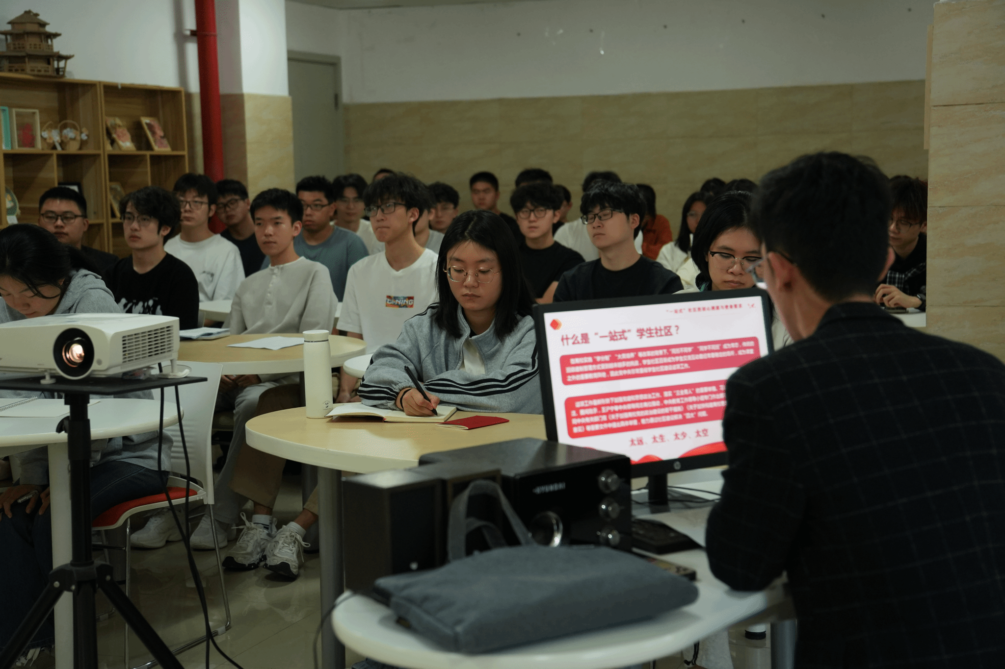 首先,郑帅老师引入学生社区建设背景及我校建设情况。当前,我们正处在时代变革的浪潮中,学生宿舍的功能已不再是单纯的“居住地”,更应成为育人阵地。通过“一站式”学生社区建设,学生在课堂之外能获得更优质的思想引领、生活服务,还可开展学业交流、共同参与文娱活动。近年来,我校积极推进学生社区建设,成立领导小组、制定工作方案,成效斐然——获评首批全国高校示范“一站式”学生社区、入选教育部首批自主试点单位,并在两次评级考核中均获A级。