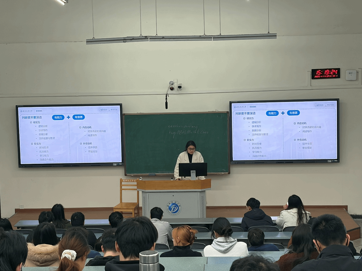 第三位主讲人,四川大学博士生王茂洋则围绕“读博决策逻辑与申请时间线”开展分享。她从“能力+意愿”双匹配框架出发,帮助同学们理清是否适合攻读博士的判断标准。围绕博士申请的硬性要求、不同类型的报考方式以及时间线规划,她结合自身经历给出了清晰可操作的路线图,包括研究计划书撰写、目标导师调研、复试准备等多个关键环节。她特别强调复试中的英文能力、研究计划清晰度以及与导师研究方向的契合程度的重要性,并建议同学们尽早制定个人发展规划,在探索中不断调整方向。她表示,读博是一场长期马拉松,只要保持积极心态、勇于尝试,每一步都会成为未来成长的基石。