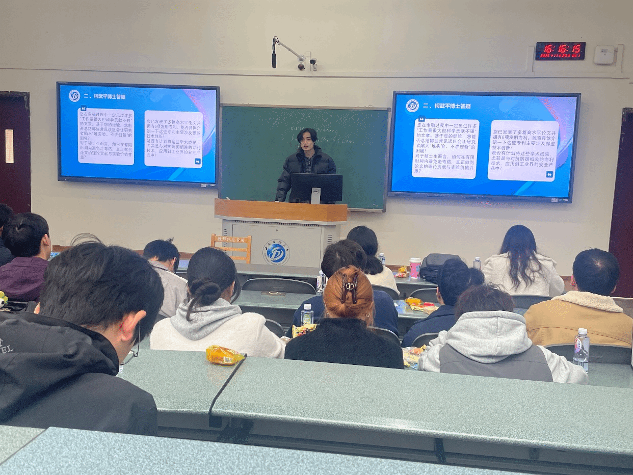 随后,柯武平博士以扎实的科研经历、丰富的论文发表经验以及鲜活的博士申请案例,为同学们带来一场极具实操性的科研与深造分享。他从自身5篇SCI论文、6项发明专利的积累过程切入,详细讲解了科研选题逻辑、论文撰写策略、审稿意见处理方法等科研成长路径。他强调:“科研工作应以问题驱动为核心,有想法就落地,边做边学才能不断迭代”。围绕博士申请,他系统介绍了从联系导师、准备材料到复试考核的全流程,结合电子科技大学实际经验,深入分析了科研成果、方向契合度与导师选择对申请结果的关键影响。他鼓励大家大胆尝试,不要被未曾尝试的困难吓倒,很多事情做了才发现,远比想象中轻松。