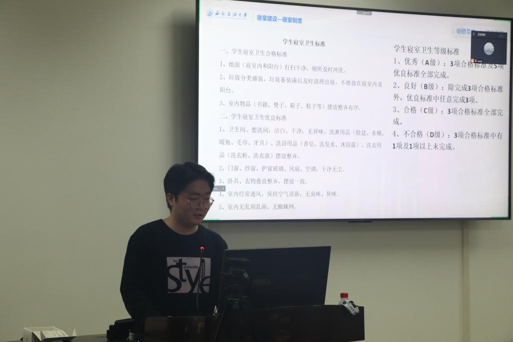 悬衡而知平,设规而知圆。宣讲人明确提出寝室需要达到的卫生标准和纪律要求,同时学校会进行定期宿舍检查,在每学期末对宿舍评级,评级优秀的宿舍会有综测加分奖励。