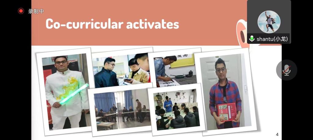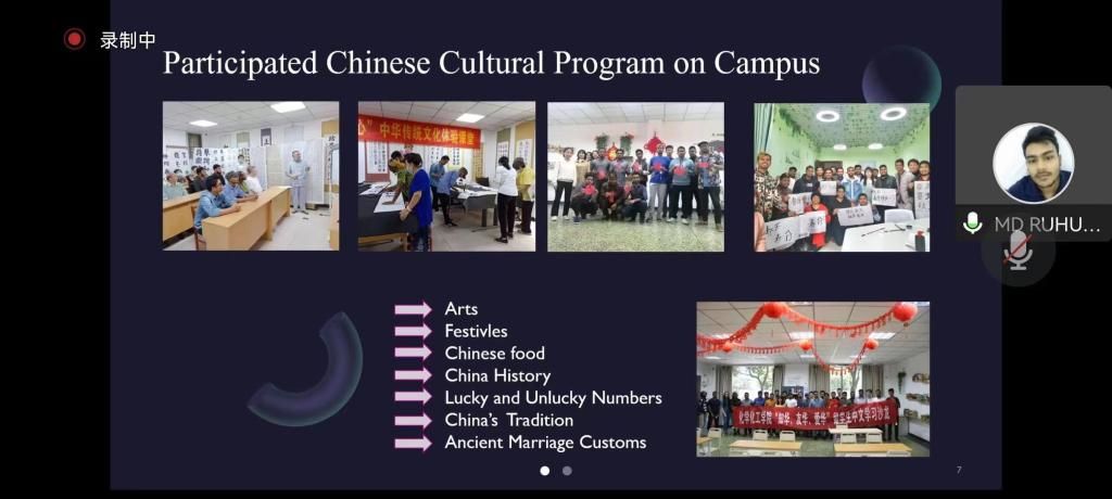 会上,三位来自不同国家的学生分享了自己来到中国、来到西南石油大学这个大家庭的有趣经历和文化生活体验。Shantu(小龙)同学是一名计算机科学与技术专业2019级的学生,来到成都三年有余,课余时间他参加过很多文化活动,他谈到:“中国功夫尤其让我痴迷,在一招一式的动作间我领略了中华武术的魅力,也增强了自己的体魄。”书法也是深受国际学生喜爱的一项中华优秀传统文化项目,19级的Ruhul同学说:“汉字是一门很深的学问,写好汉字更是一件有意义且乐趣无穷的事情,每一次落笔内心都很平静。”身在国外的Ravindi同学也与大家一同分享了自己喜爱的中国美食,度过的中国节日以及结识的中国好友。