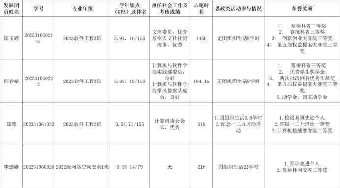 为使具有政治觉悟的学生不断进步,提升其政治素养,根据《共青团团章》等规定,本着公平、公正、公开的原则,在经过团委综合多方面考量后,现将2025年春季学期计科院发展团员名单(共4名)公示如下: