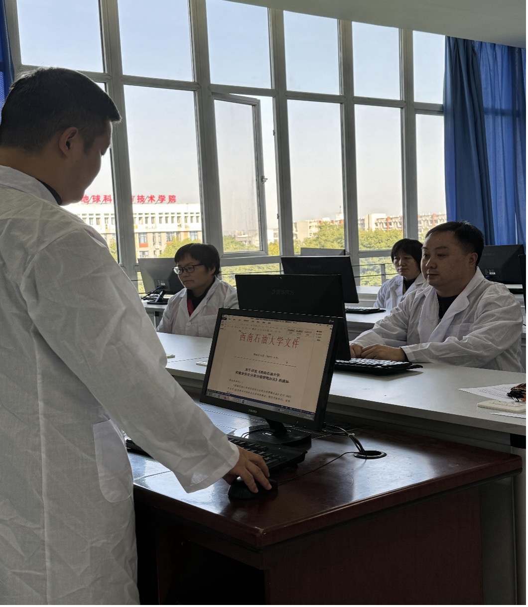 刘科老师结合实验室安全检查中发现的用电安全案例,着重介绍了用电安全中容易被忽略的错误处置方式,提醒实验人员勿因小过酿成大错;唐亮老师解读了《西南石油大学实验室安全分类分级管理办法》,从分类分级规则、防护措施、检查力度等方面强调了分类分级管理的重要性和必要性,并对下一阶段工作作了部署;任馨老师通过搜集典型案例,就火场逃生自救方法、如何扑救初期火灾、如何查找火灾隐患、如何使用消防设施等注意事项进行了详细讲解,使同志们对消防安全有了更高的安全意识。